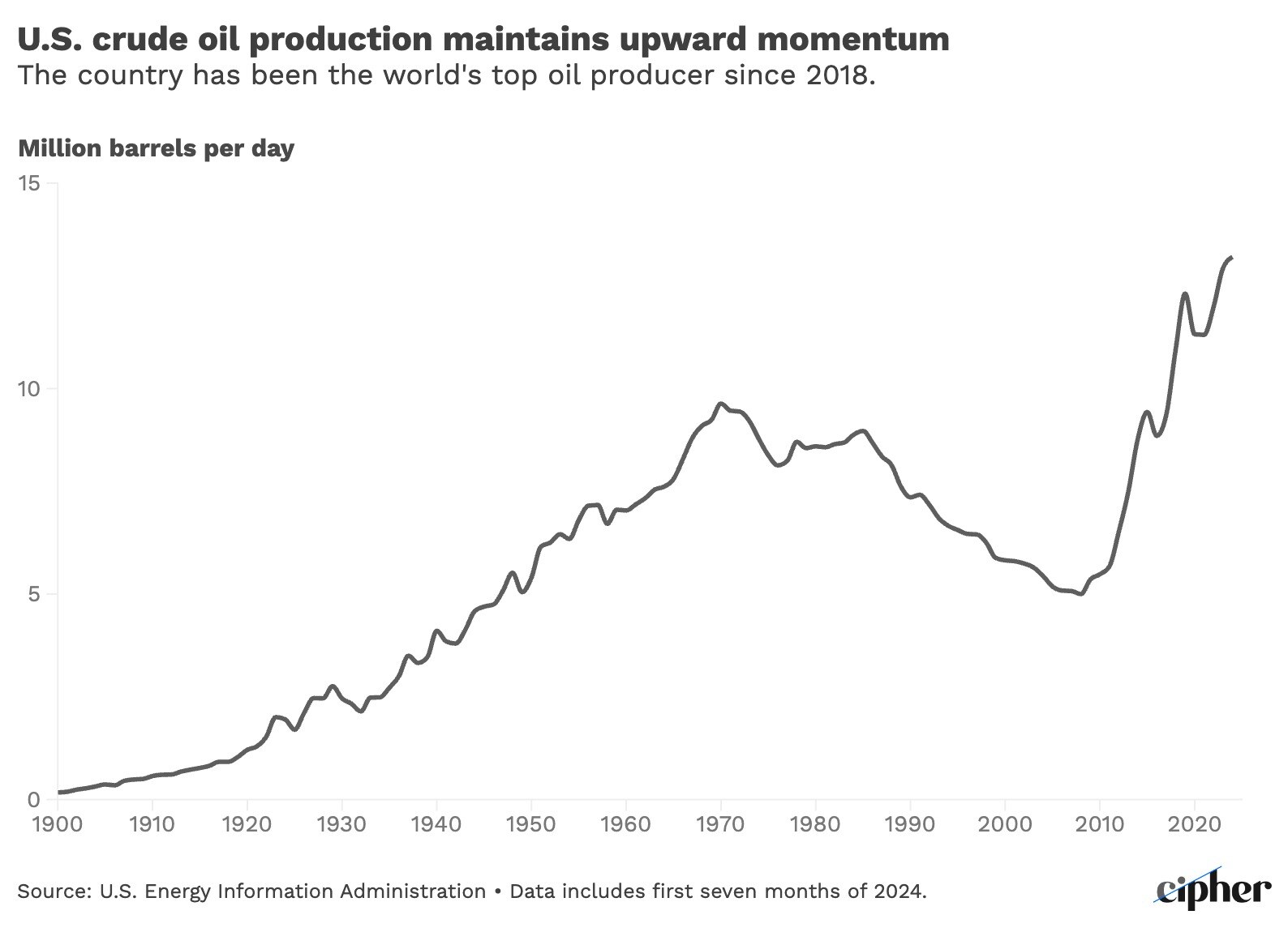 U.S. crude oil production has been rising since 2009, except for brief pauses caused by low prices in 2015 and the economic disruption during the Covid pandemic. In December 2023, the U.S. produced a record average of 13.3 million barrels-per-day.