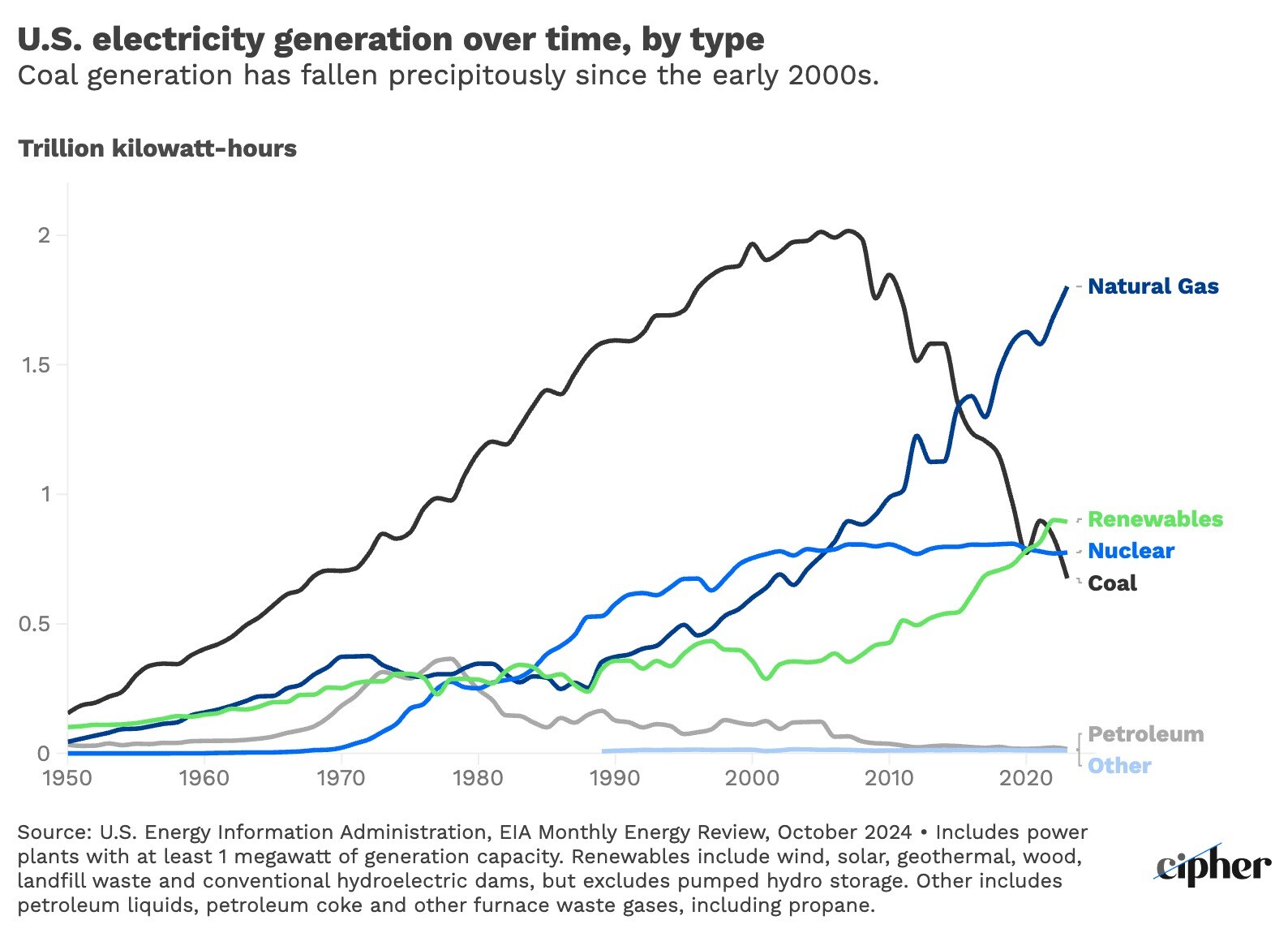 Source: U.S. Energy Information Administration, EIA Monthly Energy Review, October 2024 • Includes power plants with at least 1 megawatt of generation capacity. Renewables include wind, solar, geothermal, wood, landfill waste and conventional hydroelectric dams, but excludes pumped hydro storage. Other includes petroleum liquids, petroleum coke and other furnace waste gases, including propane.