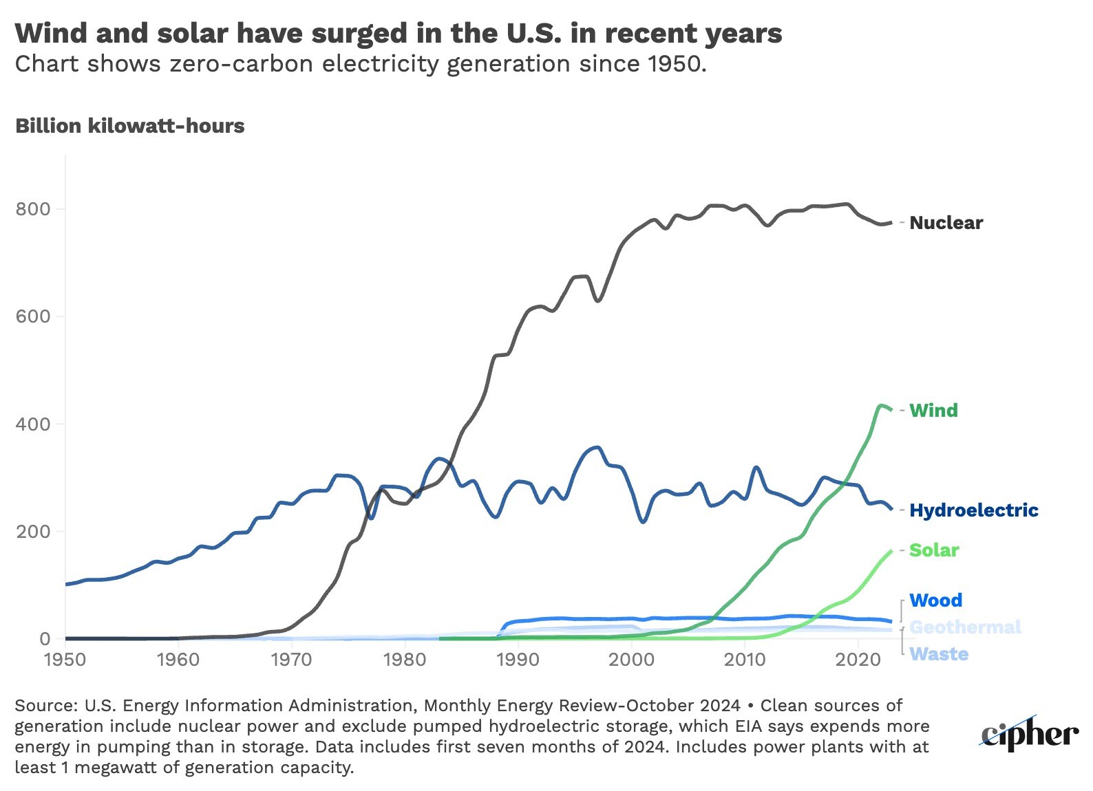 Meanwhile, more and more of that electricity is coming from clean sources. Clean-electricity deployment and generation continues to grow, led in recent years by cheap solar, despite headwinds from high interest rates, supply chain disruptions, permitting and grid connection challenges in recent years.