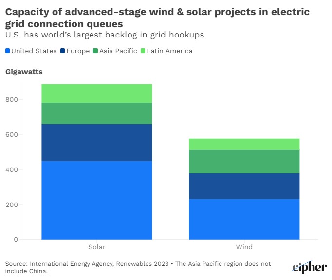 With 677 GW of wind and solar projects awaiting connection in the United States, the U.S. backlog is twice as much as the backlog in the EU, nearly three times that of the Asia Pacific region (excluding China) and four times as much as the backlog in Latin America.