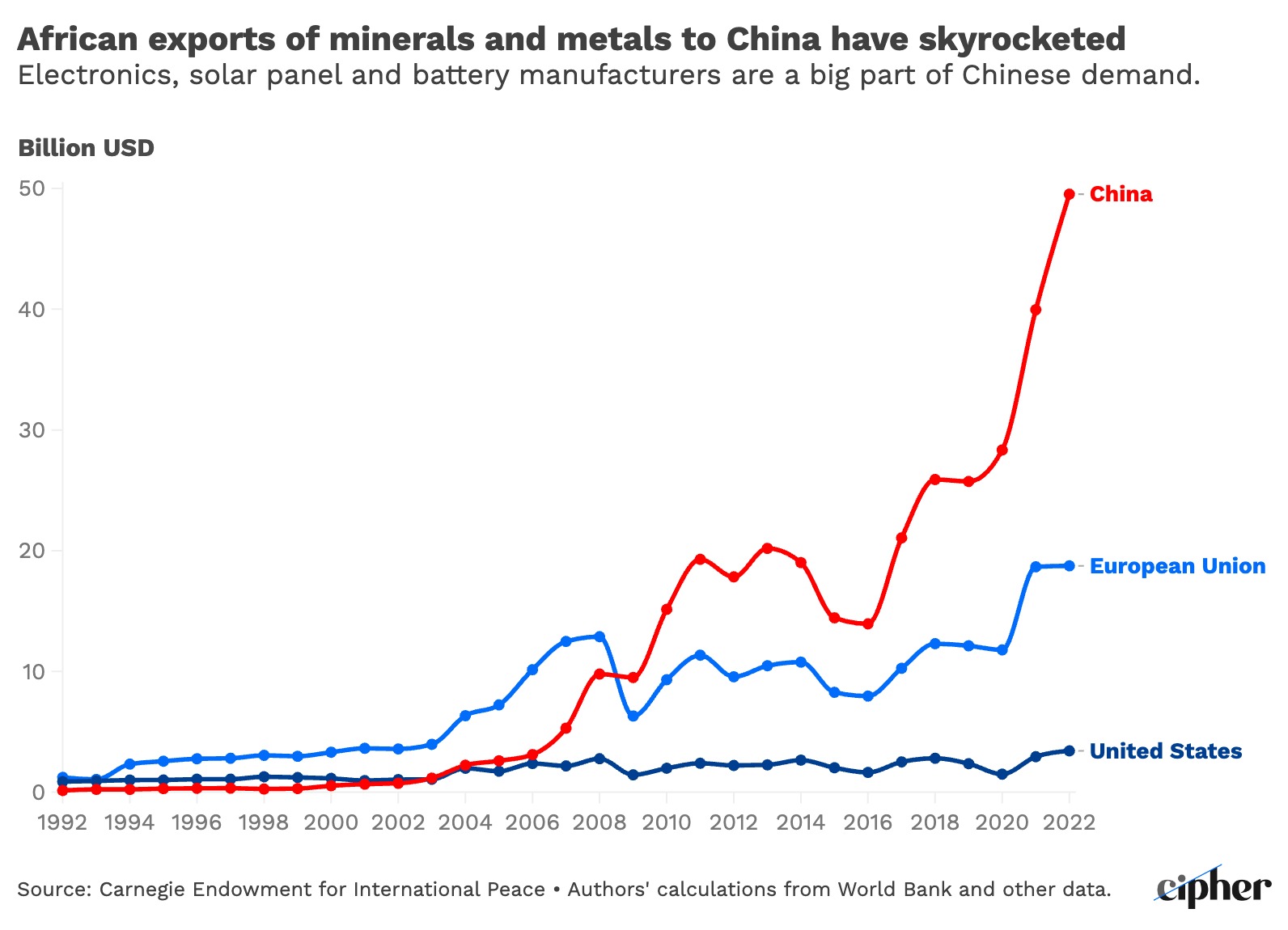 Africa has received unparalleled attention from China over the past two decades. China has turned to the continent to fill an ever-greater share of its critical minerals needs as the Asian economic powerhouse has become the world’s dominant manufacturer of clean energy technologies, from solar panels to batteries to electric vehicles. Meanwhile, U.S. imports from the region have stagnated.