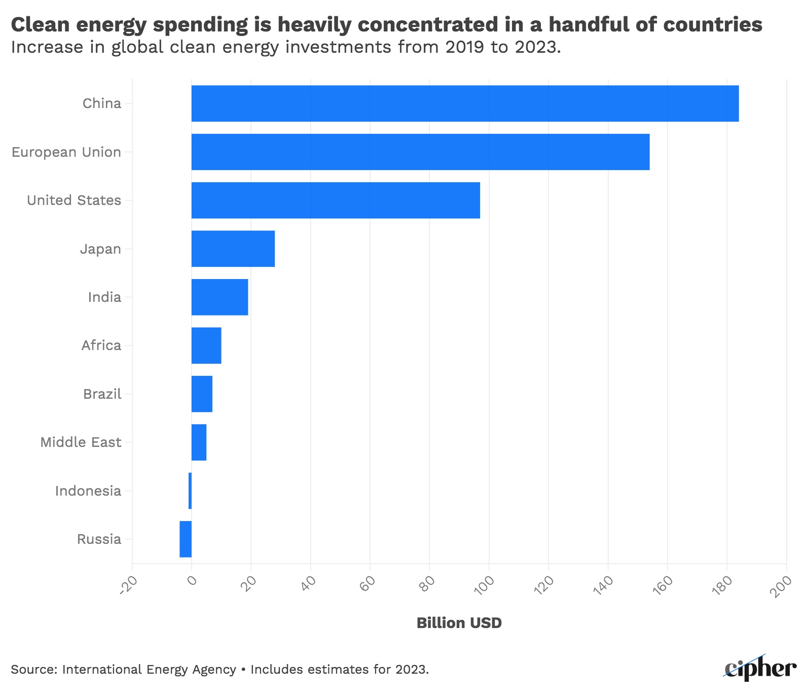 Clean energy investment is ramping up fast, but most of it is still not reaching beyond the world’s richest countries.