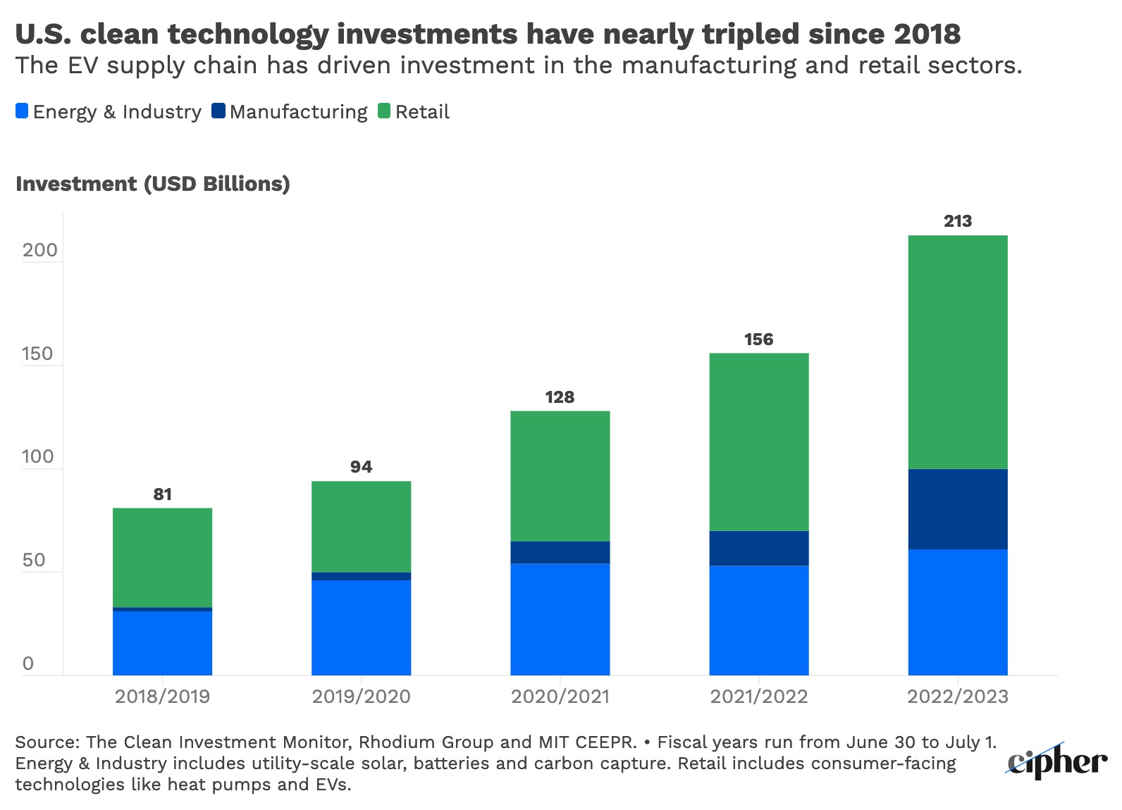 Source:The Clean Investment Monitor, Rhodium Group and MIT CEEPR. • Fiscal years run from June 30 to July 1. Energy & Industry includes utility-scale solar, batteries and carbon capture. Retail includes consumer-facing technologies like heat pumps and EVs.