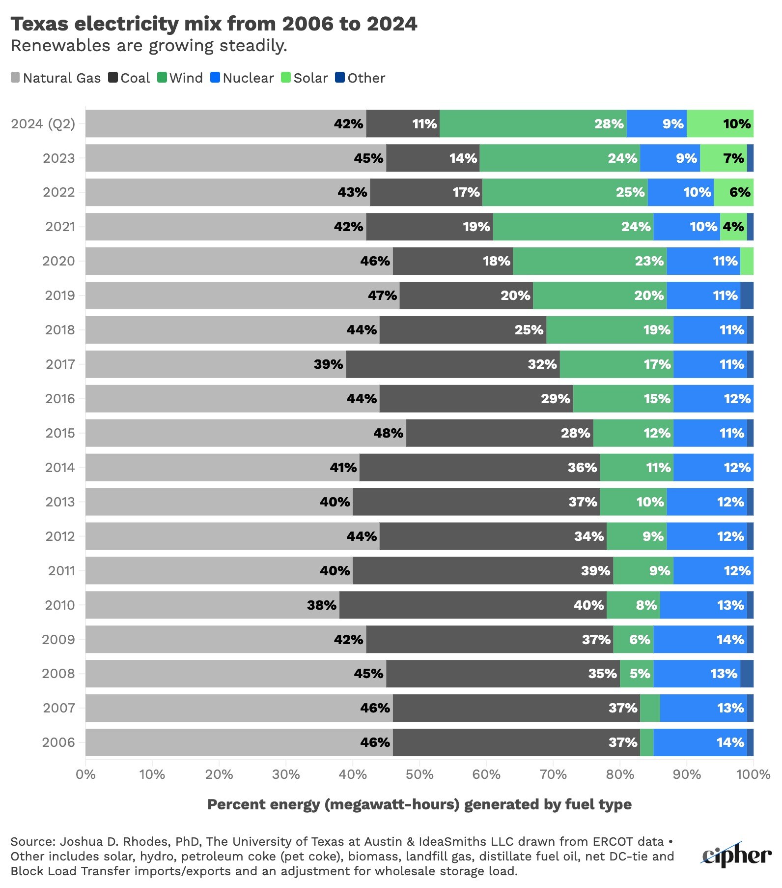 Source: Joshua D. Rhodes, PhD, The University of Texas at Austin & IdeaSmiths LLC drawn from ERCOT data • Other includes solar, hydro, petroleum coke (pet coke), biomass, landfill gas, distillate fuel oil, net DC-tie and Block Load Transfer imports/exports and an adjustment for wholesale storage load.