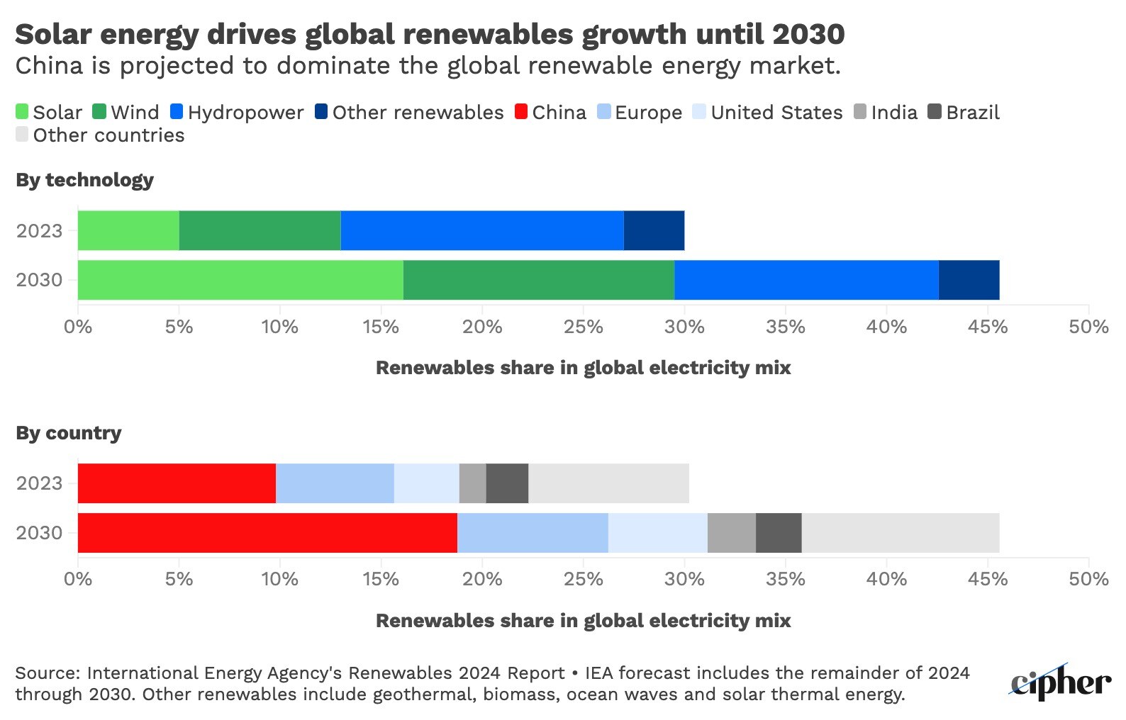 Source: International Energy Agency's Renewables 2024 Report • IEA forecast includes the remainder of 2024 through 2030. Other renewables include geothermal, biomass, ocean waves and solar thermal energy.