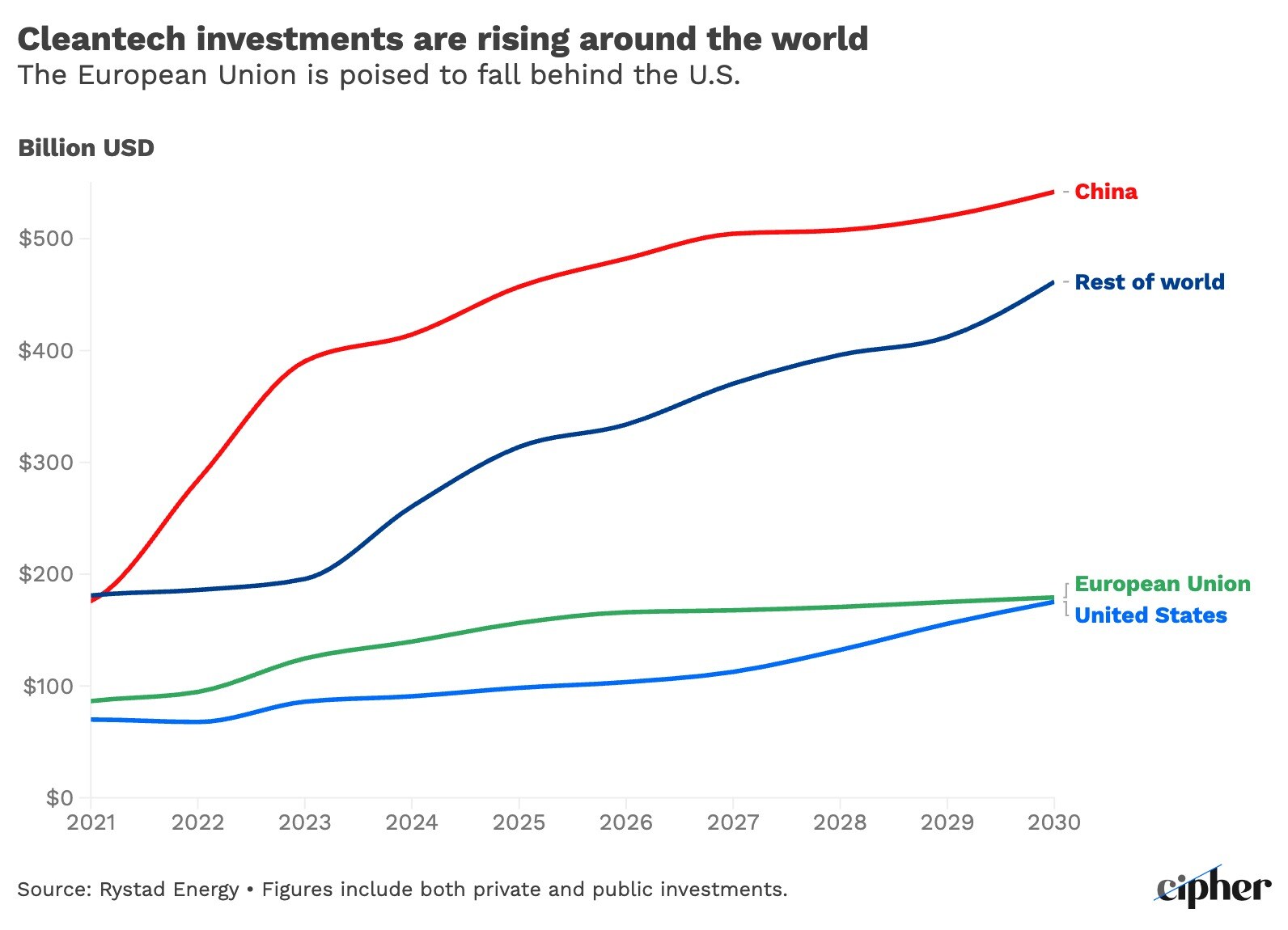 The bloc’s capital investments in clean technologies — including renewables, carbon capture, utilization and storage, hydrogen, batteries and nuclear power — totaled $125 billion in 2023. China, by comparison, spent $390 billion last year. The United States is currently behind the EU in annual cleantech spending, having invested just $86 billion in 2023. But the 2022 Inflation Reduction Act is set to stimulate U.S. investments; such expenditures are expected to equal and then surpass the EU’s clean energy spending after 2030.