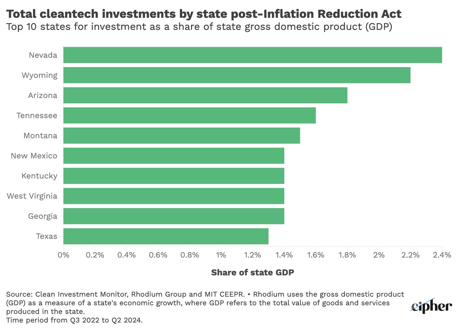 Source: Clean Investment Monitor, Rhodium Group and MIT CEEPR. • Rhodium uses the gross domestic product (GDP) as a measure of a state's economic growth, where GDP refers to the total value of goods and services produced in the state. Time period from Q3 2022 to Q2 2024.